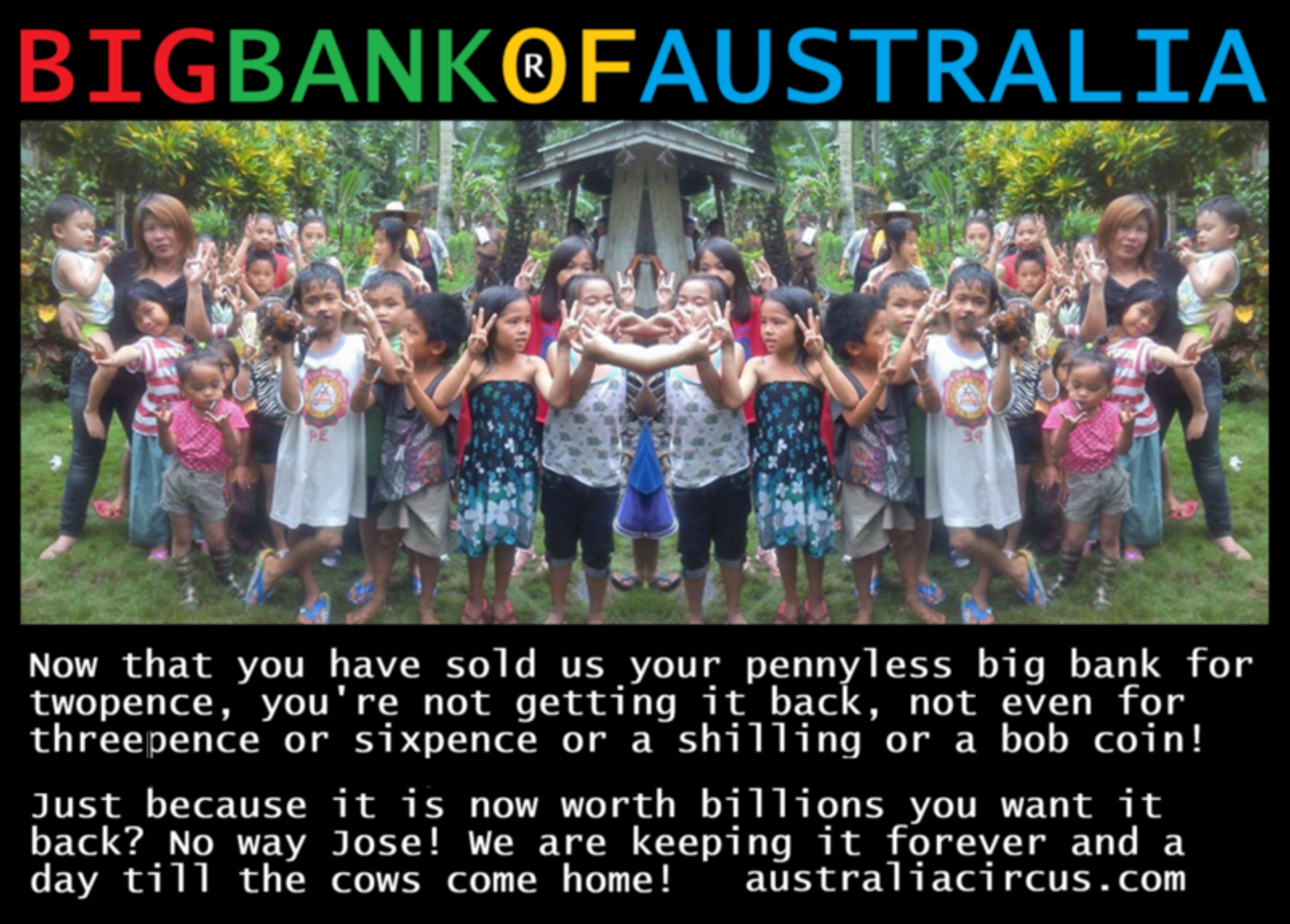 All the dummies in The Philippines now own the Big Bank of Australia because they are way ahead of the smarties in Australia and the Hole Wide World with Dum Sum technology. They are so advanced they do not know how they always get the right answers. Try them, if they are asked for the 10 digit total of the Unknown Dum Sum, whatever they say is correct. It is up to the smarties to come up with the 20 digits in the question, or else they have to pay for their mistakes! Why can't they figure out how dum babies can manipulate unknown numbers